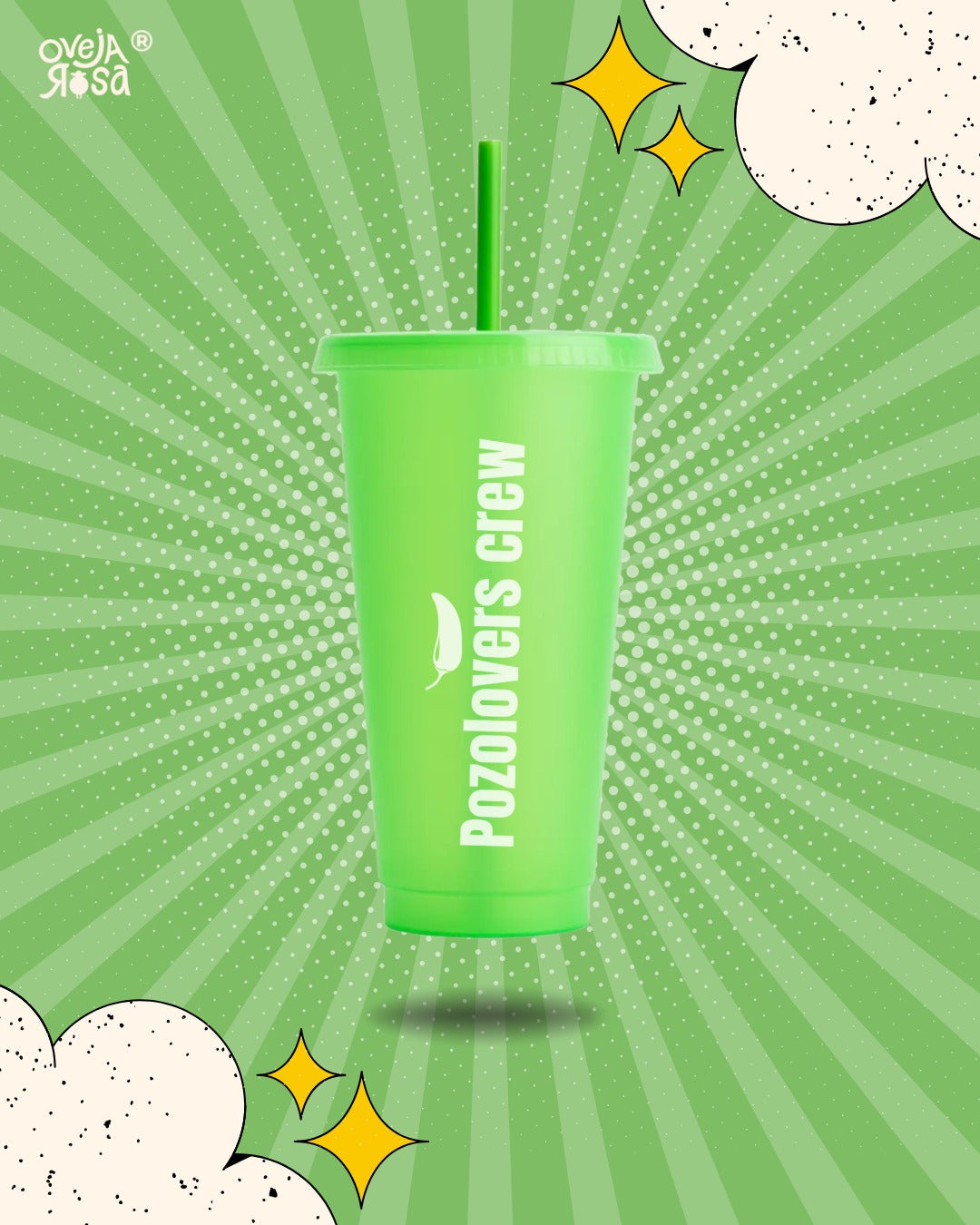 Vaso de plástico con tapa y popote. Es color verde y lleva un mensaje que no pasa desapercibido: